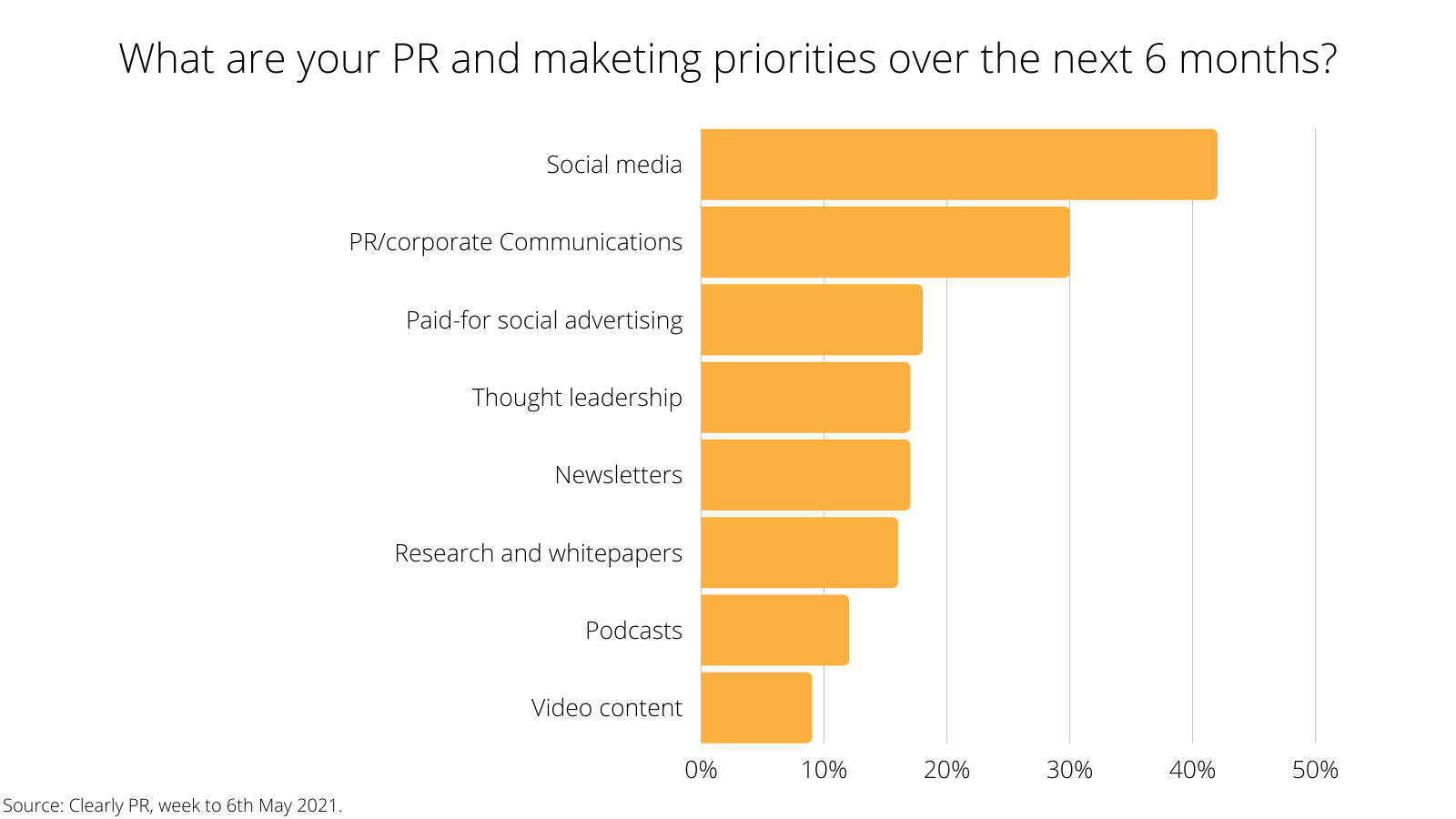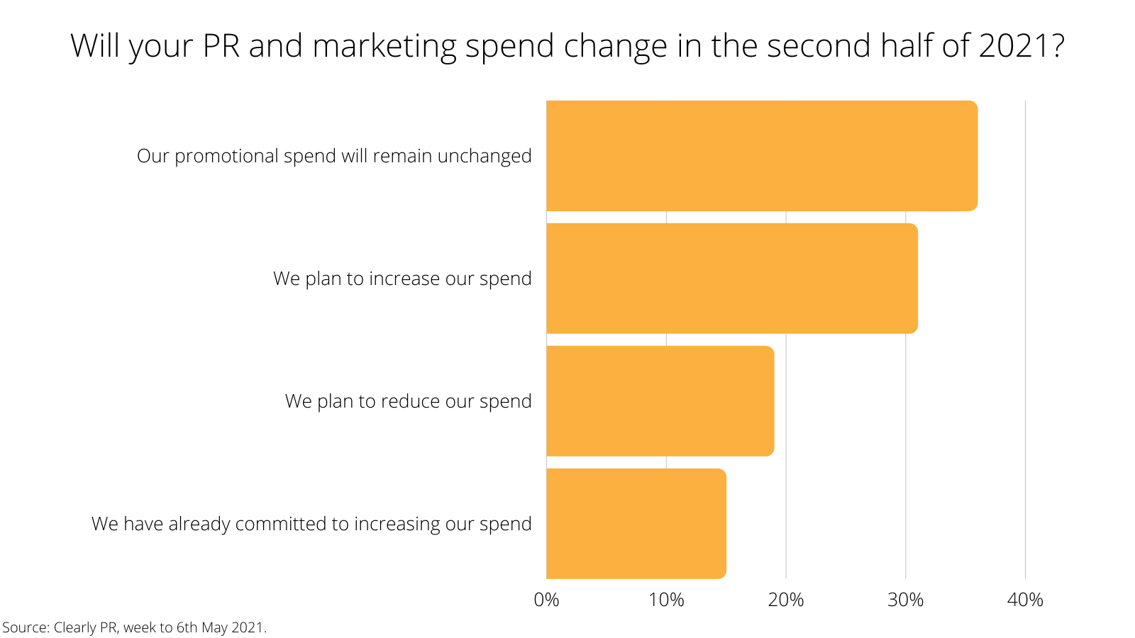 These are the findings of a survey conducted by Clearly PR in the week to 6th May 2021. The 107 respondents, who consisted of marketing professionals and executives with responsibility for their organisation’s promotional budgets, were asked how the pandemic has impacted their PR and marketing and their intentions for the remainder of 2021.